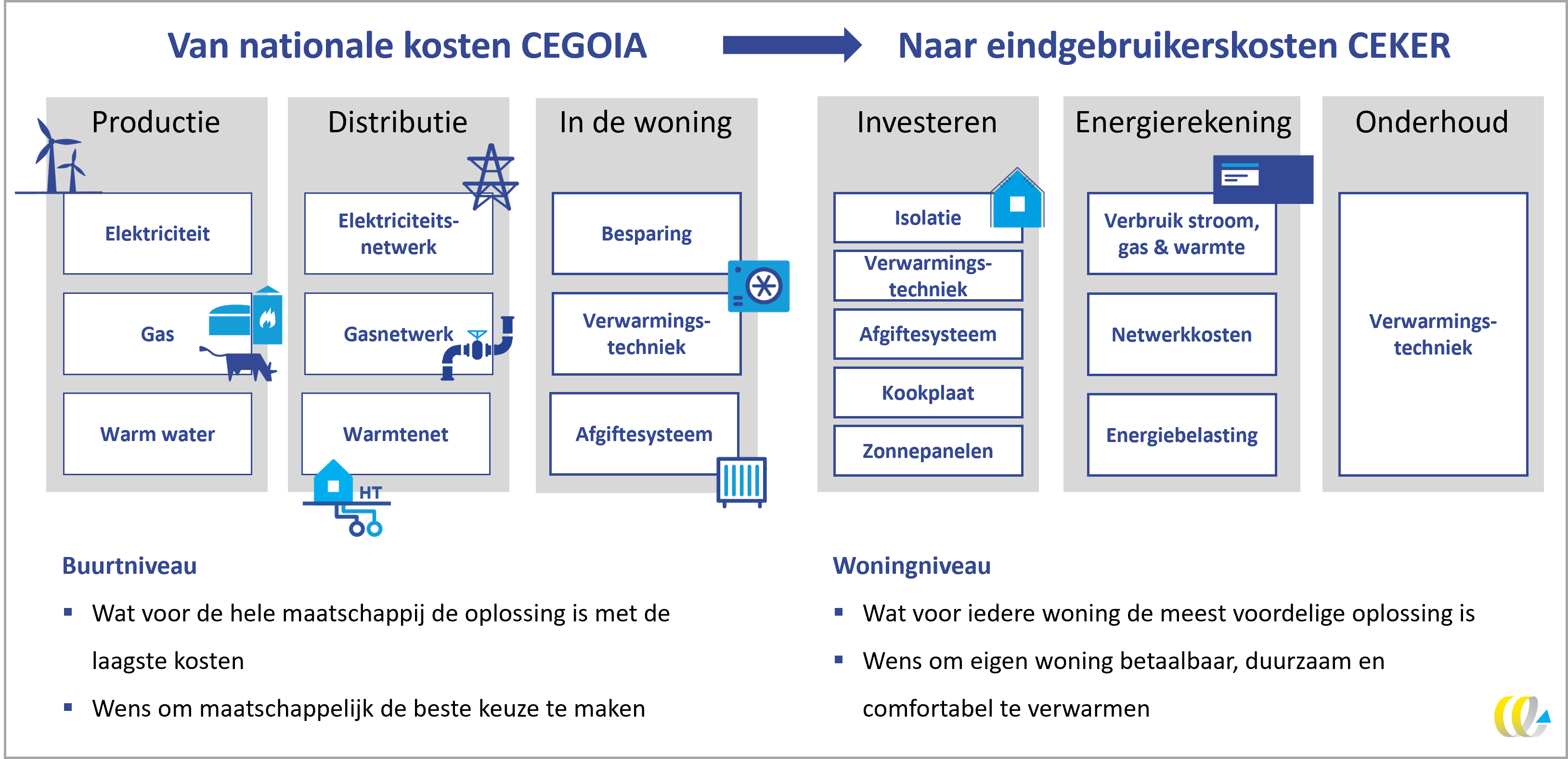 CE Delft heeft twee modellen die de kosten aardgasvrije warmtetechnieken in de gebouwde omgeving berekenen: CEKER en CEGOIA. De modellen verschillen van perspectief. Het CEGOIA-model bekijkt de warmtevoorziening vanuit een nationaal perspectief. Dit model berekent de totale kosten van energieproductie, warmtevoorziening en/of grootschaligere infrastructuur. Hierbij kijkt het niet naar wie die kosten draagt. Het CEKER model kijkt vanuit het perspectief van een eindgebruiker en zijn woning. CEKER berekent alle investeringen die de woningeigenaar moet doen om te verduurzamen of van het gas af te gaan en de impact van verduurzaming op de energierekening.