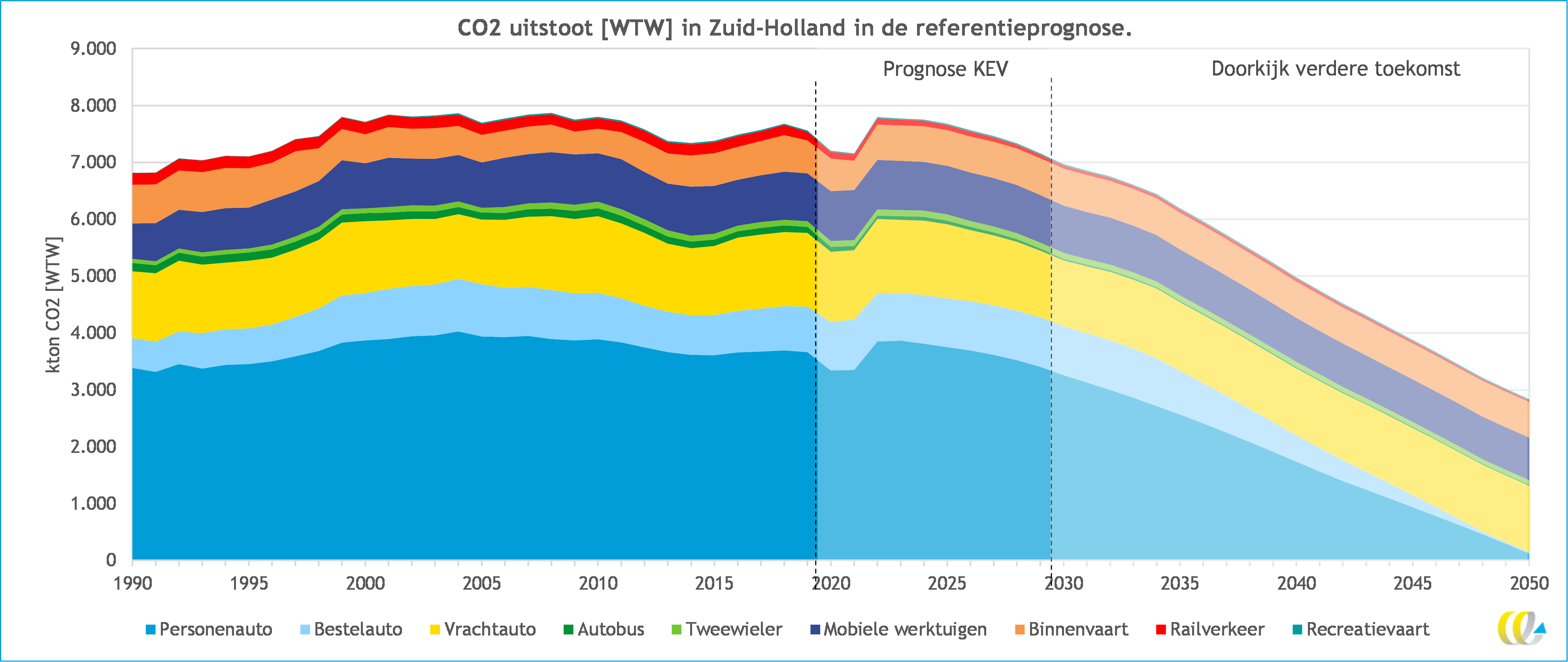 Hoe ontwikkelen de emissies zich tot 2050? CEREM is in staat om referentieprognoses te maken voor alle gemeenten, provincies, RMP-regio’s en andere combinaties van gemeenten. Hiervoor maakt het model gebruik van de Klimaatmonitor om historische emissies te kwantificeren en van de Klimaat- en Energieverkenning voor nationale ontwikkelingen van emissies. Doordat regio-specifieke kenmerken voor de verschillende regio’s kunnen worden aangepast, kan er worden ingespeeld op scenario’s die de uitkomsten nog beter op de realiteit laten aansluiten (denk aan bevolkingsgroei of samenstelling wagenpark). Zie de volgende grafiek voor een voorbeeld van CO2-uitstoot in de referentieprognose van de provincie Zuid-Holland per modaliteit.