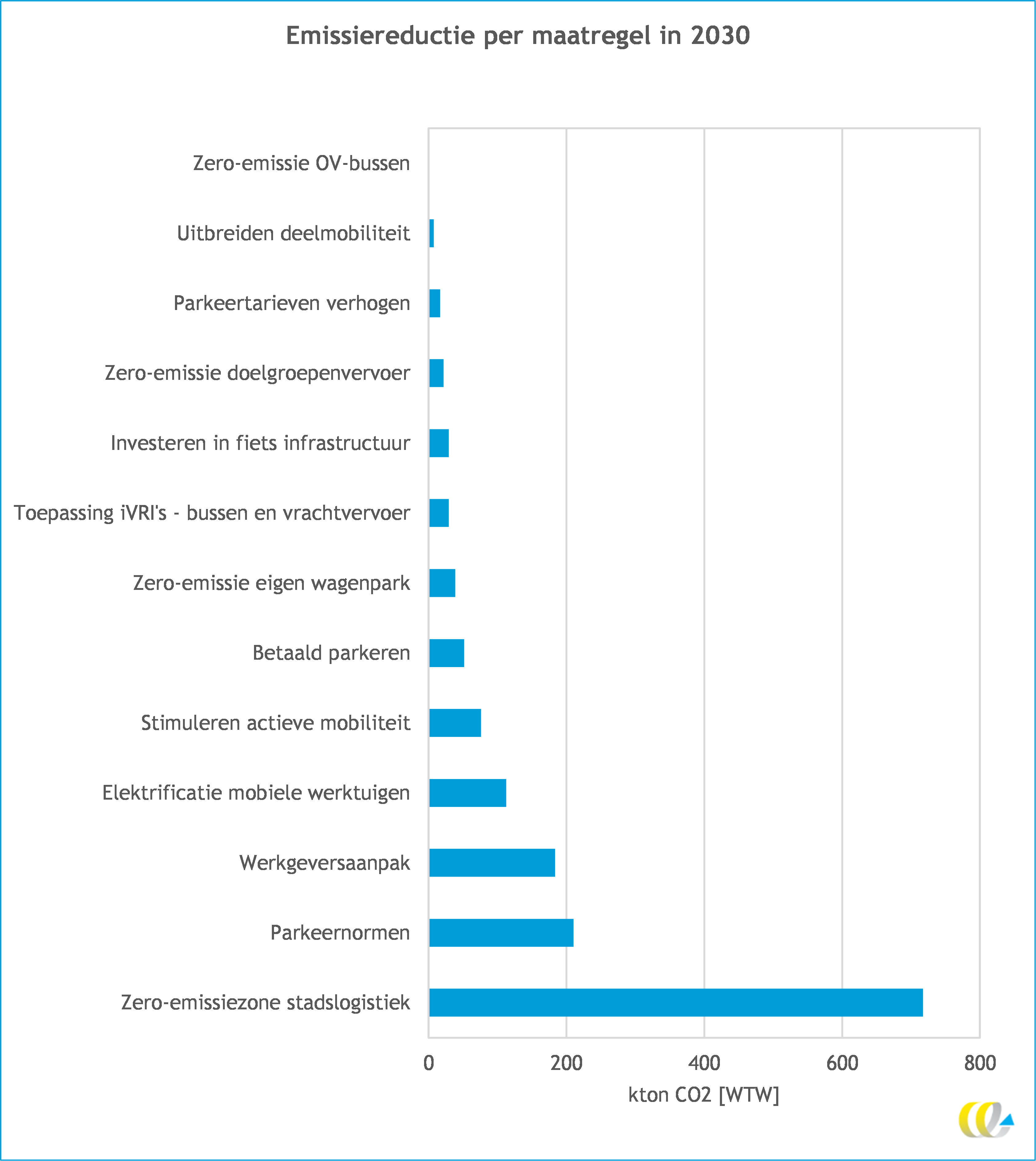 Wat is het effect van mijn beleid? Binnen mobiliteit is een breed scala aan beleidsmaatregelen mogelijk die gericht zijn op CO2-reductie en de verbetering van luchtkwaliteit. Het CEREM-model rekent vaak voorkomende maatregelen volgens een gestandaardiseerde methode door. Doordat de berekening onderscheid maakt tussen landelijk, stedelijk en hoogstedelijk gebied en doordat ambitieniveaus per maatregel kunnen worden aangepast, sluiten de effecten zo goed mogelijk aan op de lokale situatie. Op basis van de input wordt per maatregel aangegeven hoe hoog de emissiereductie is. Dit geeft inzicht in welk beleid de meeste resultaten oplevert. Zie voor een voorbeeld van de effectberekeningen de volgende grafiek.