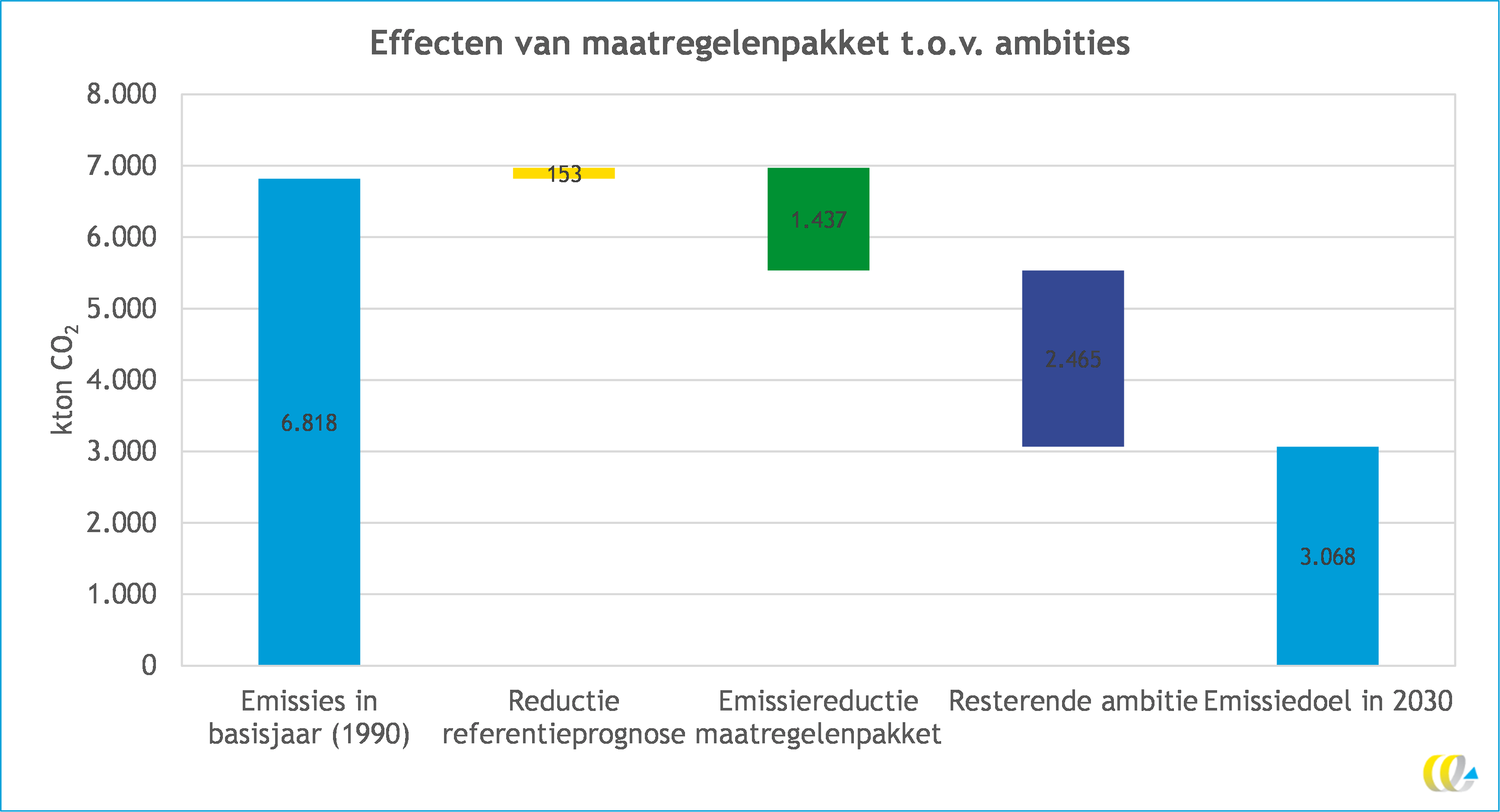 Zijn wij op weg om onze duurzaamheidsdoelen te halen? Op basis van de referentieprognose en de gekwantificeerde maatregeleffecten wordt het inzichtelijk in hoeverre de duurzaamheidsdoelstellingen van een bepaalde regio reëel zijn. CEREM berekent de effecten van het maatregelenpakket, het geprognosticeerde emissieniveau in het zichtjaar en in hoeverre dit afwijkt van het emissiedoel voor dit zichtjaar. De resultaten van deze berekening zijn weergegeven in onderstaand voorbeeld.